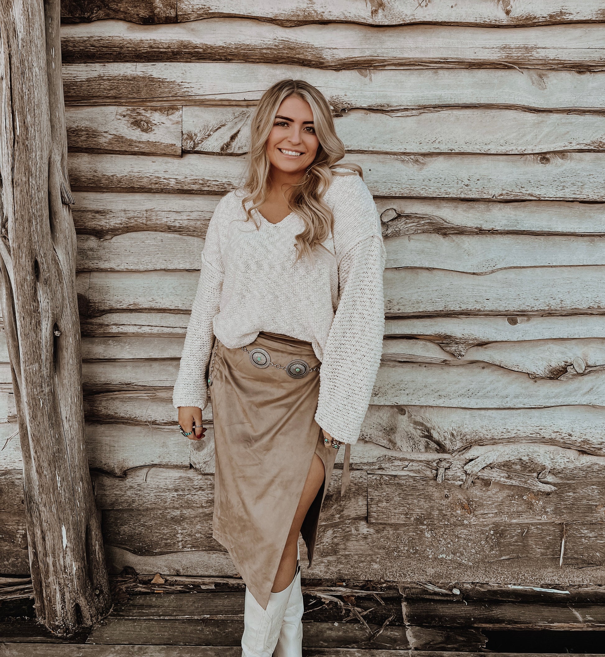 Our exquisite Suede Wrap Skirt is an unparalleled example of craftsmanship in the modern era. This tasteful design features a stone color, luxuriously soft suede material, and is tailored to accentuate every curve. With a high waisted fit and subtle zipper in the back.
