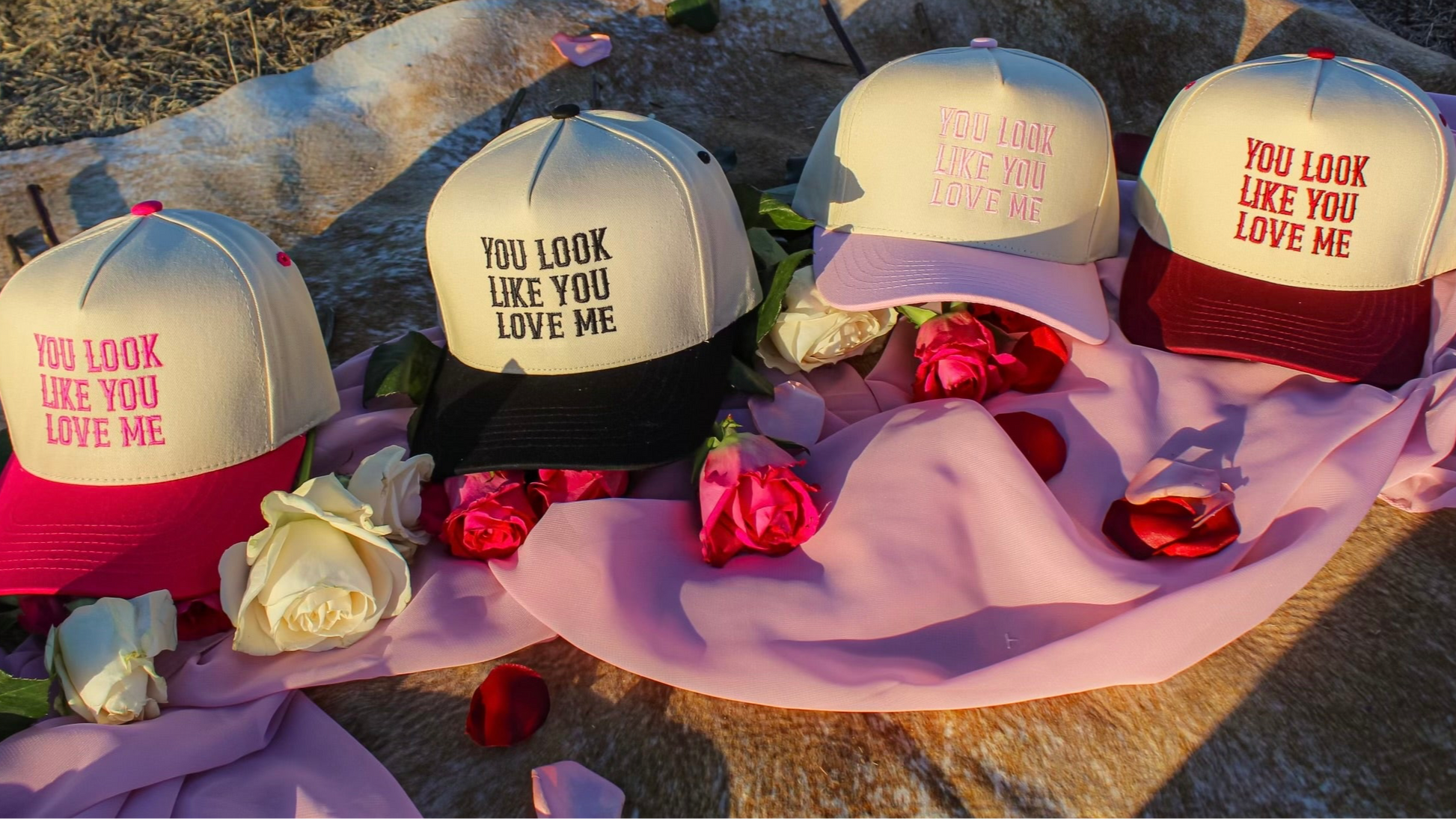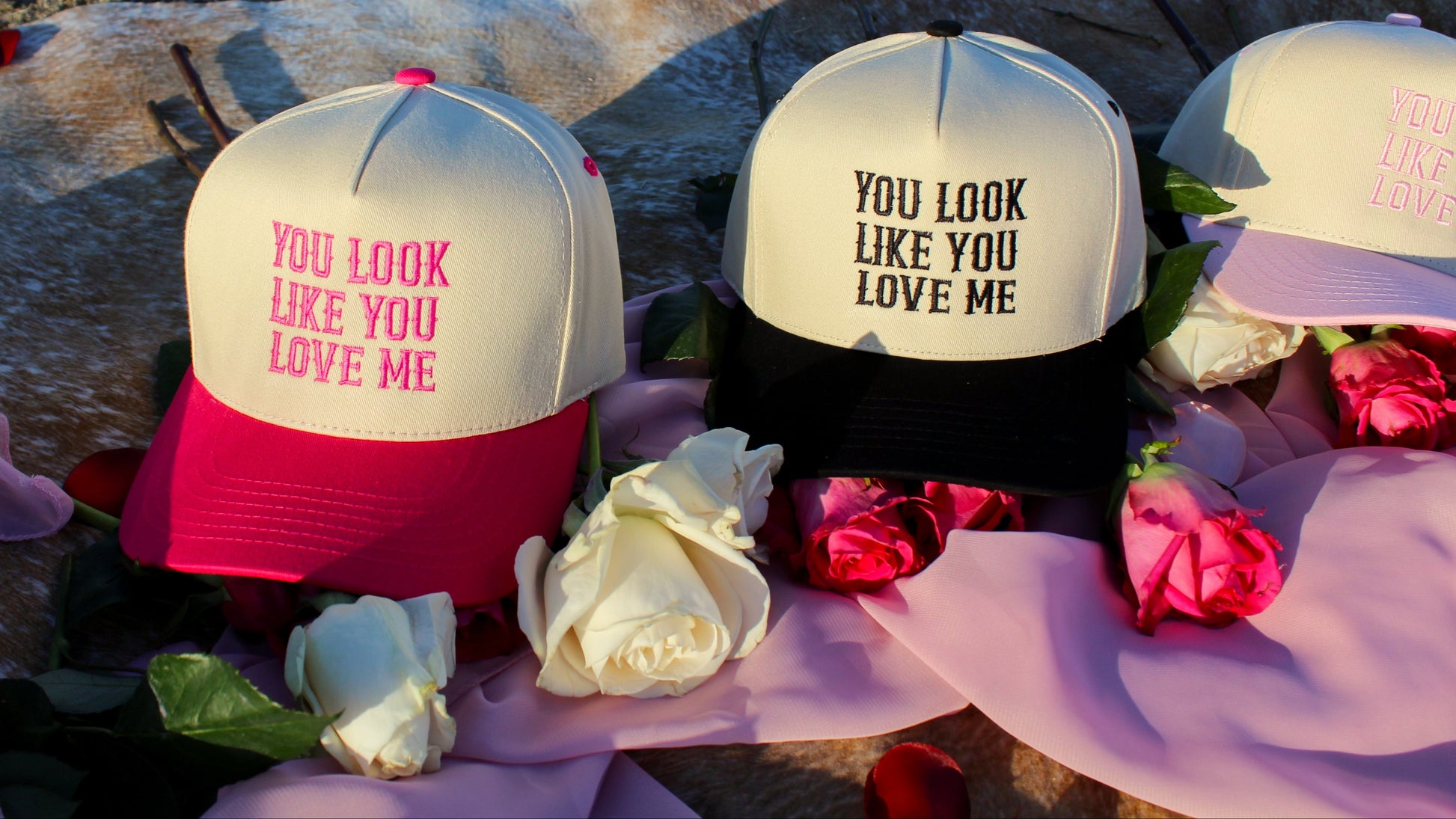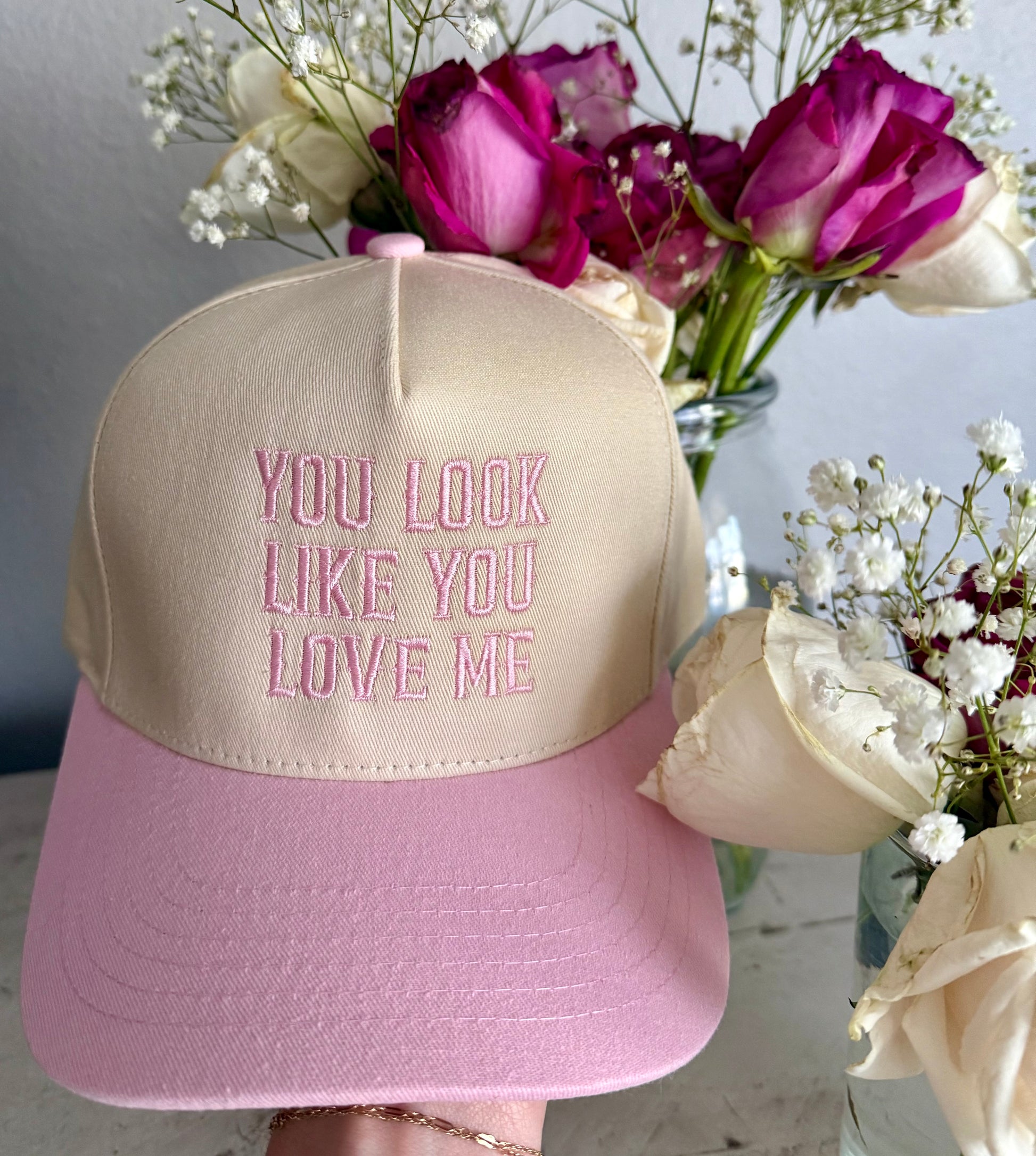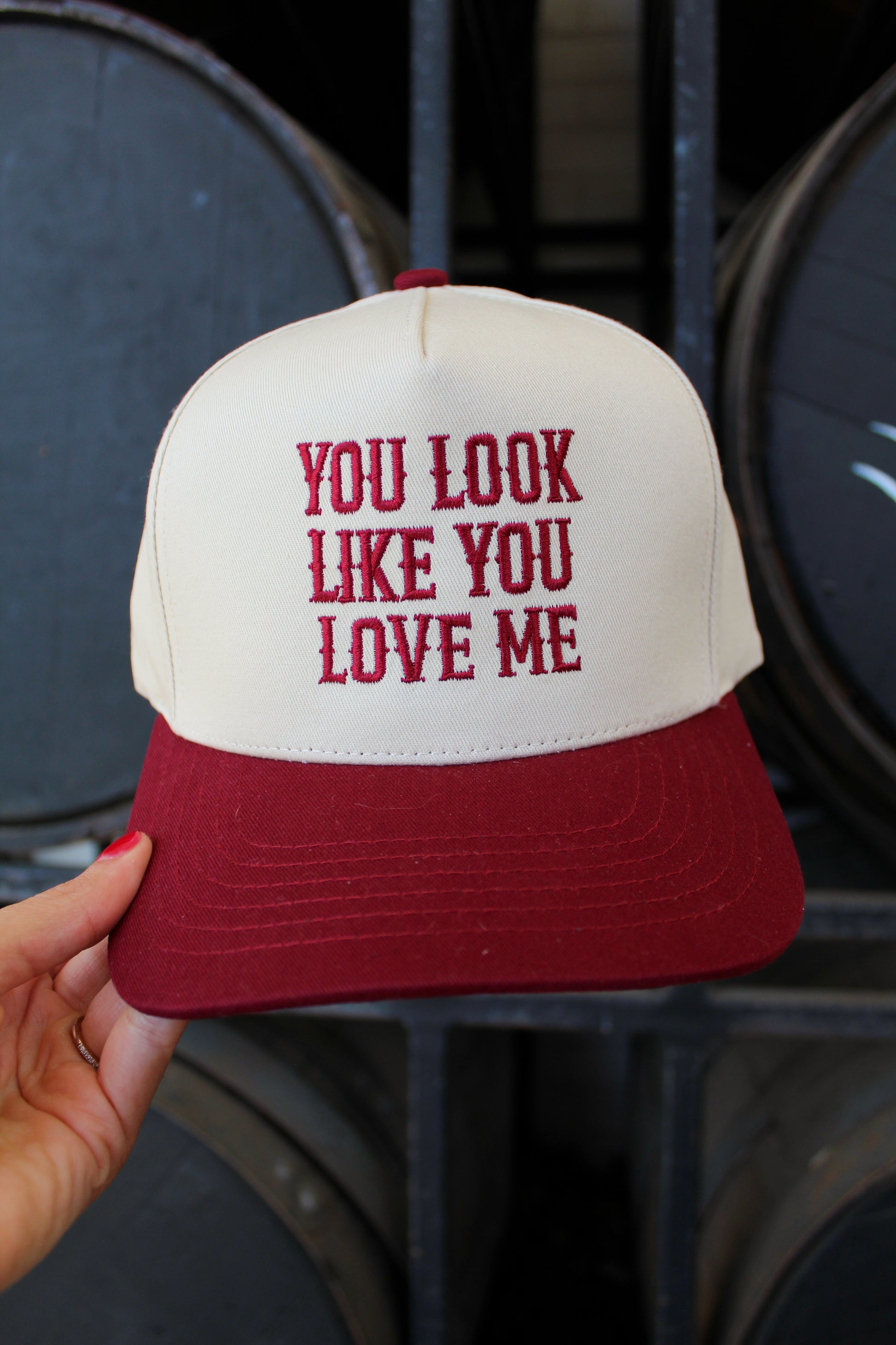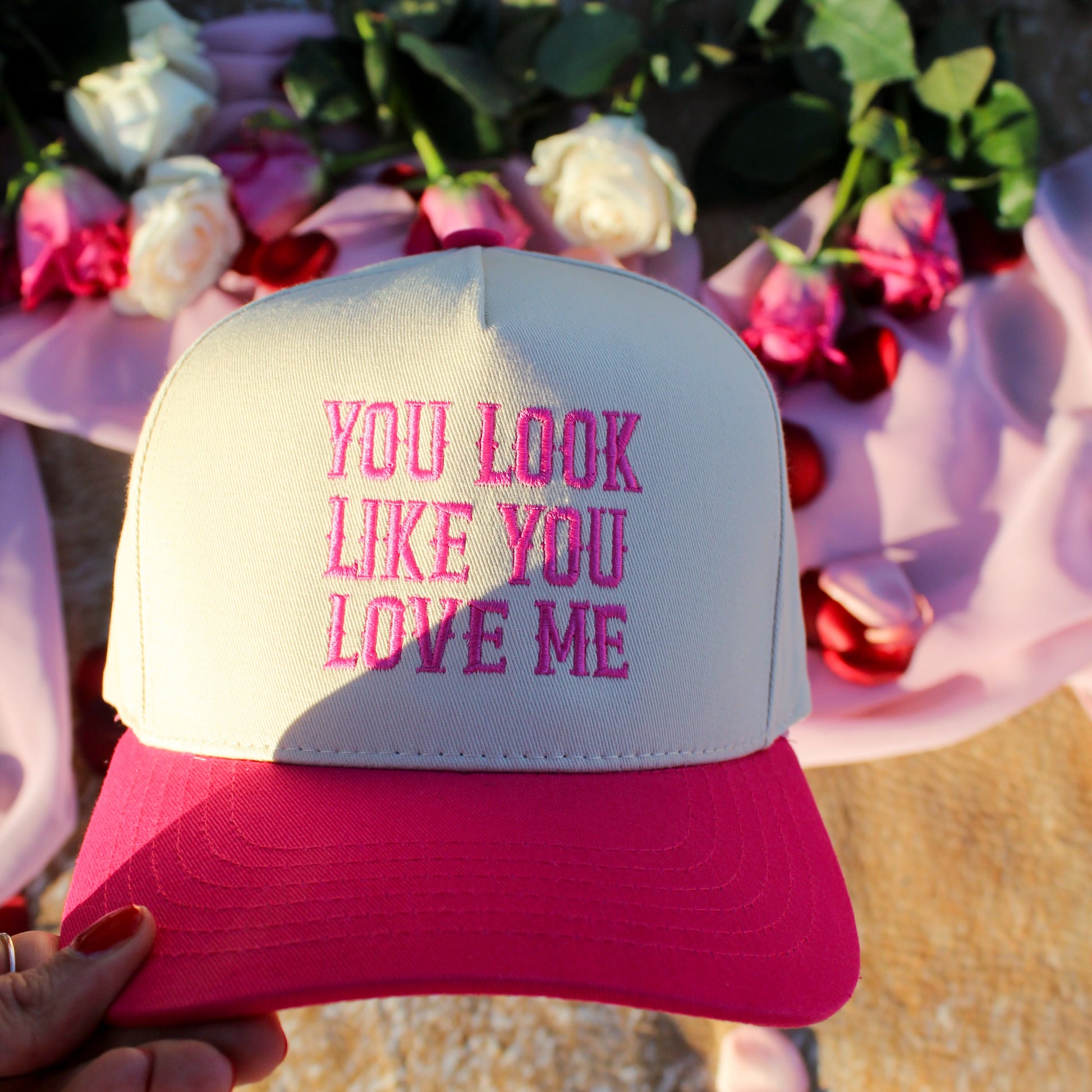 Show off your love for country music and bold, fun style with this exclusive trucker hat! Featuring the iconic embroidered phrase "You look like you love me," inspired by the hit song by Riley Green and Ella Langley, this hat is perfect for fans who want to wear their heart on their sleeve (or, well, on their head)!